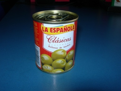 ご存知のようにスペインではオリーブの消費が多く、オリーブの生産量が2002年では世界一だったそうです。オリーブオイルの原料となるほか、酢漬けにしたものもよく食べられます。スペインに旅行されたことがある方は、バルなどでビールを頼むと一緒に出てきたのを覚えていらっしゃるでしょう。サラダのトッピングとしてのせられていることも多いです。我が家ではそれほど食べませんが、お客さんがあるときにビールと一緒に出すのに、缶詰を用意しています。これは、種を除いてアンチョビーがつめてあるもの。ビールのおつまみとしておいしいですよね。